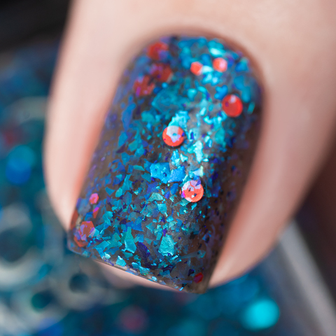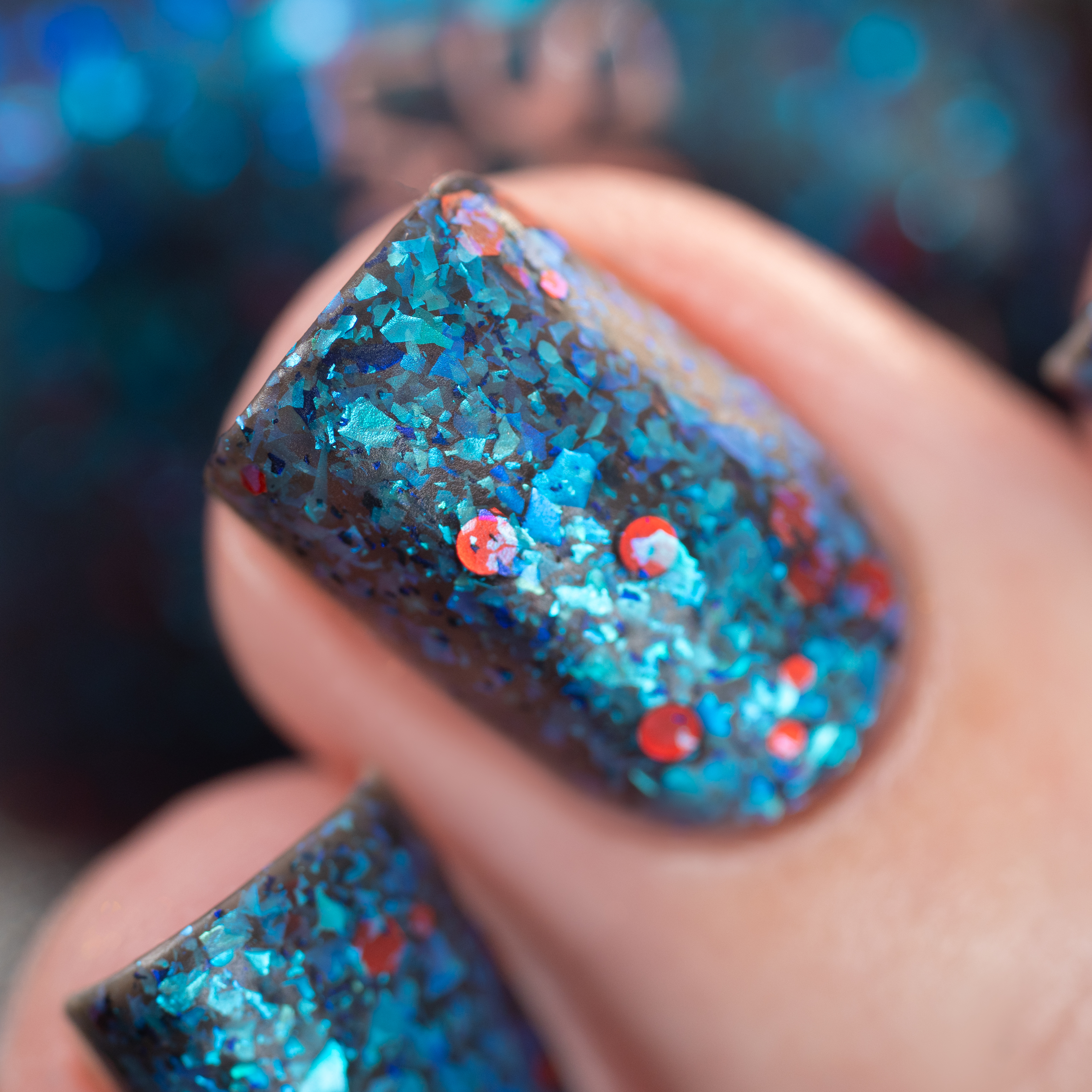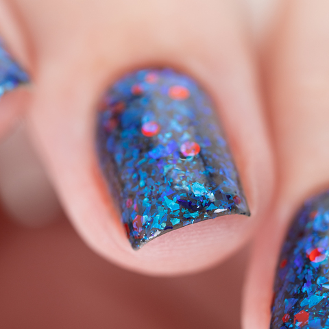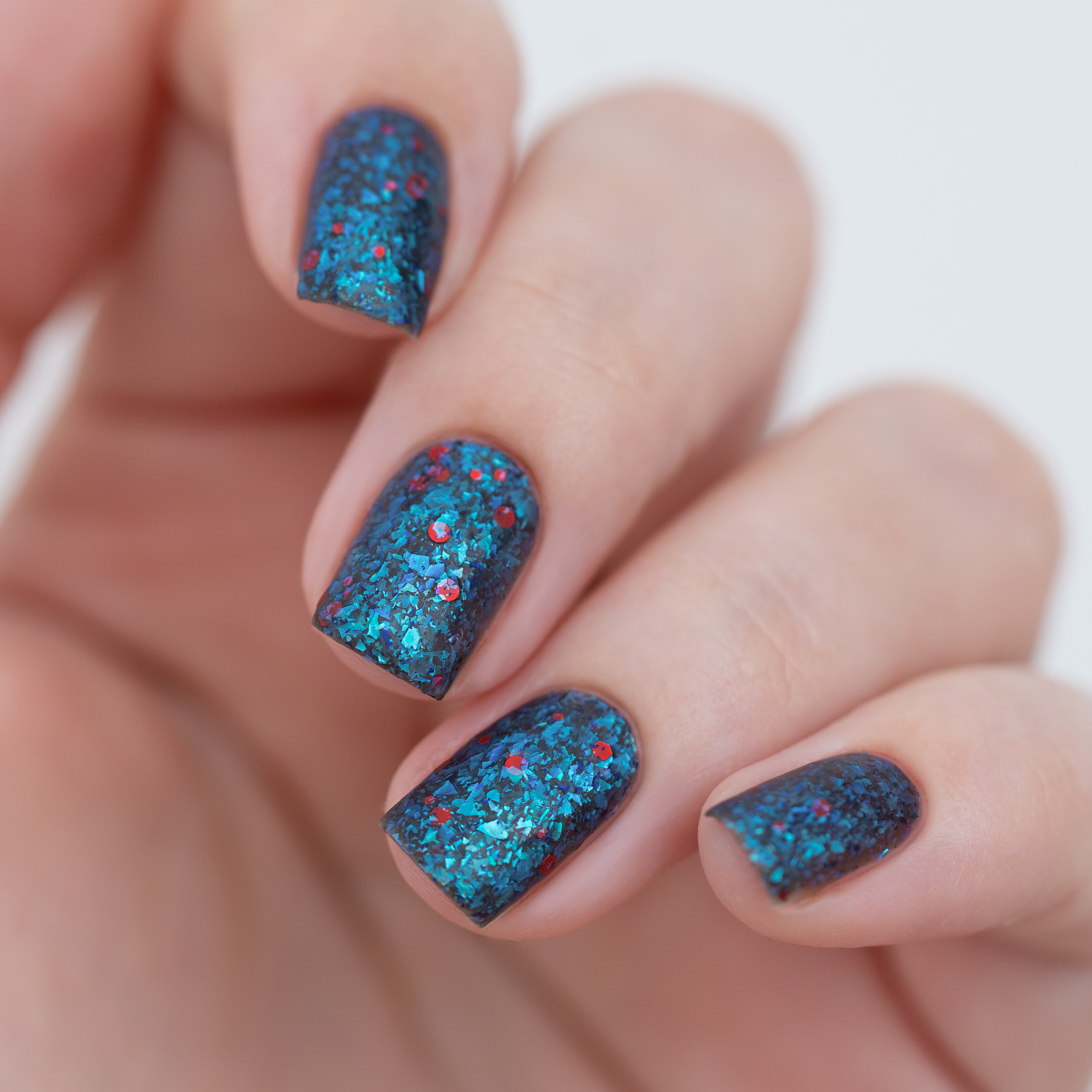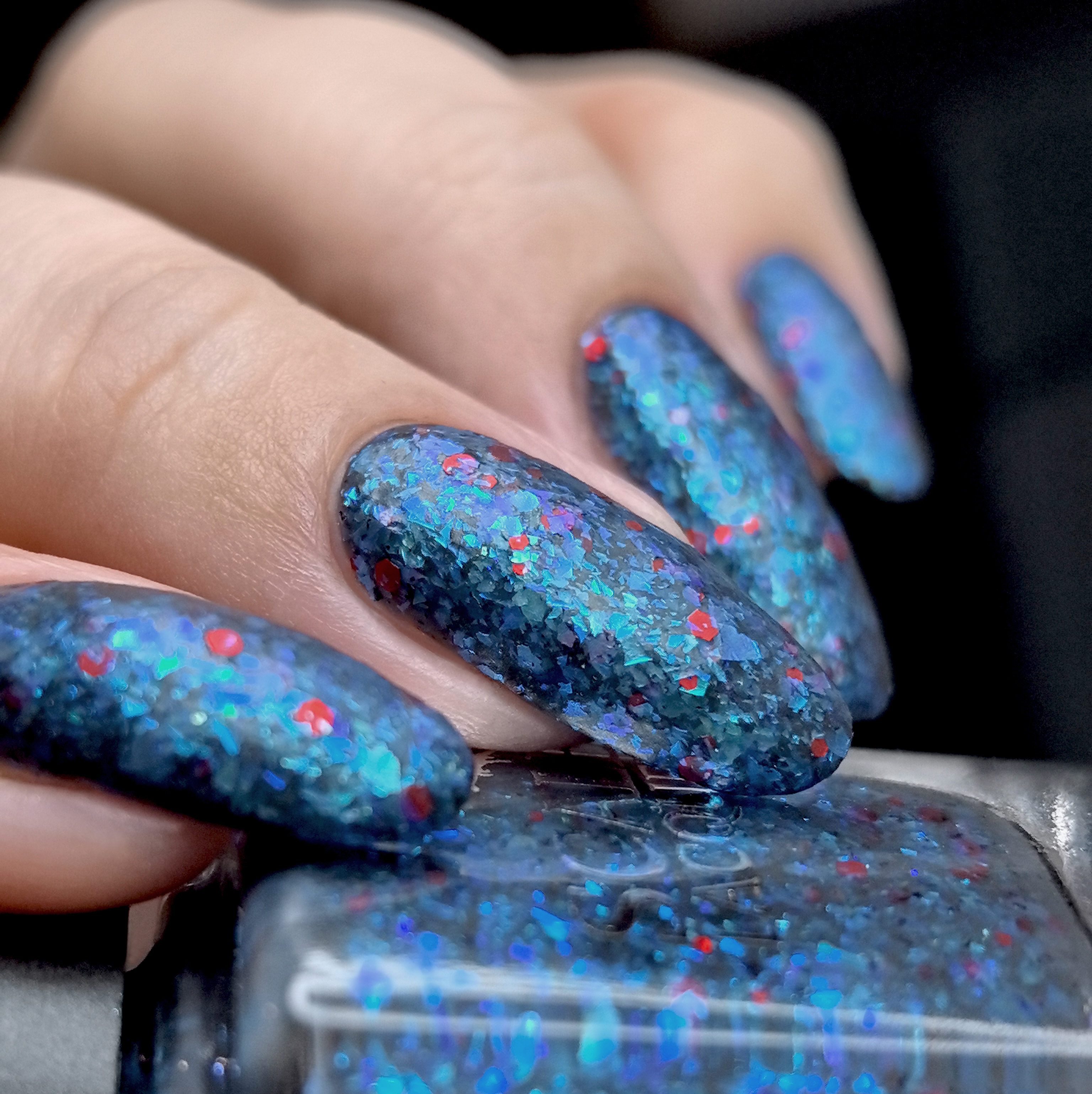 Микс голубой слюды и разноразмерного шестигранного и круглого красного глиттера в темно-серой матовой базе