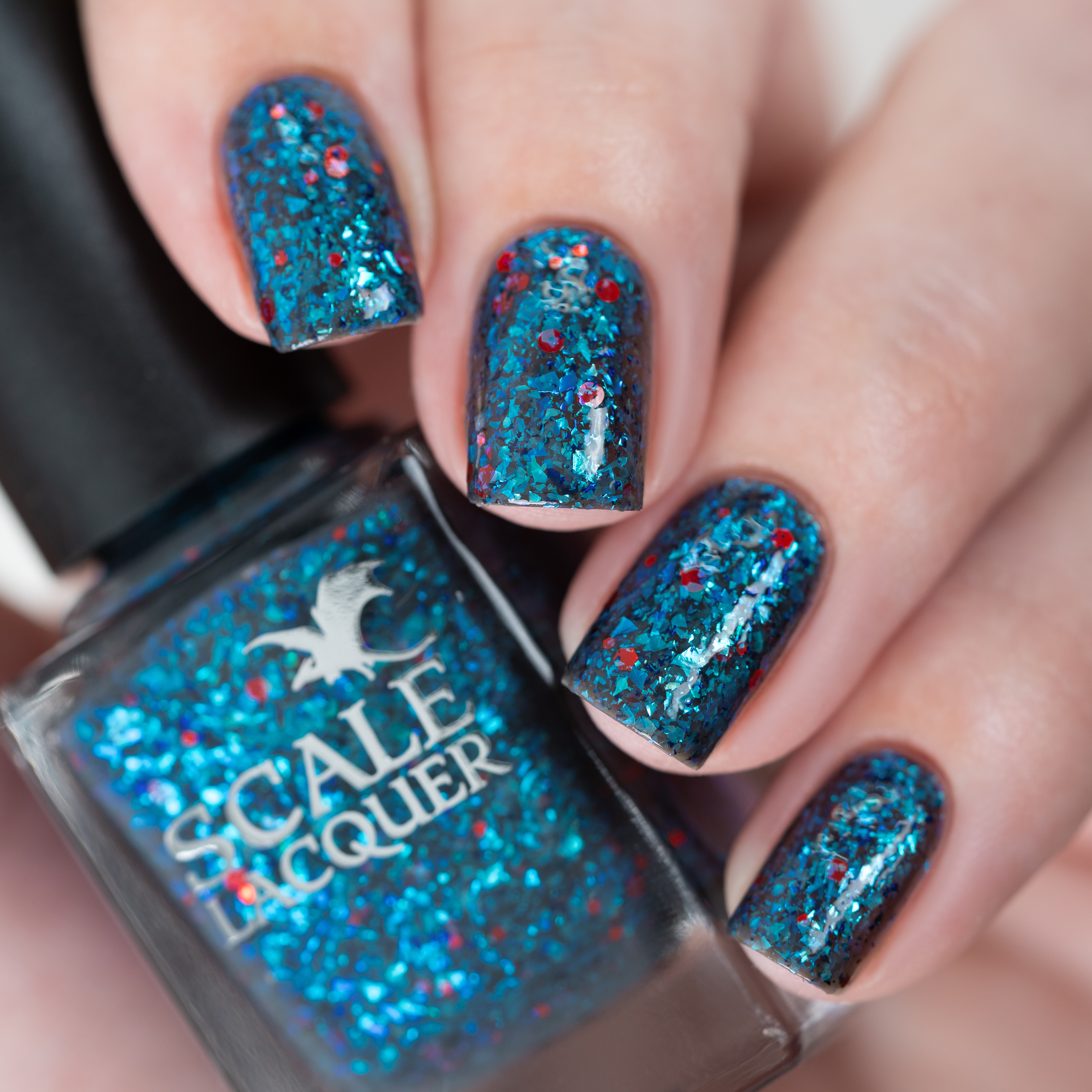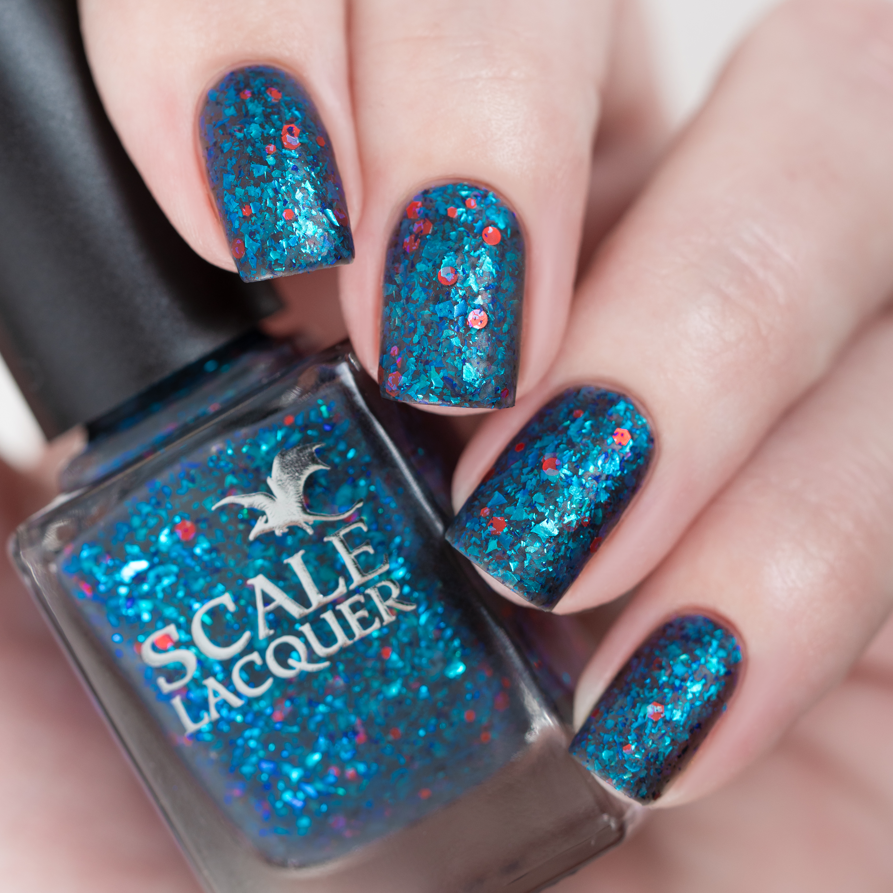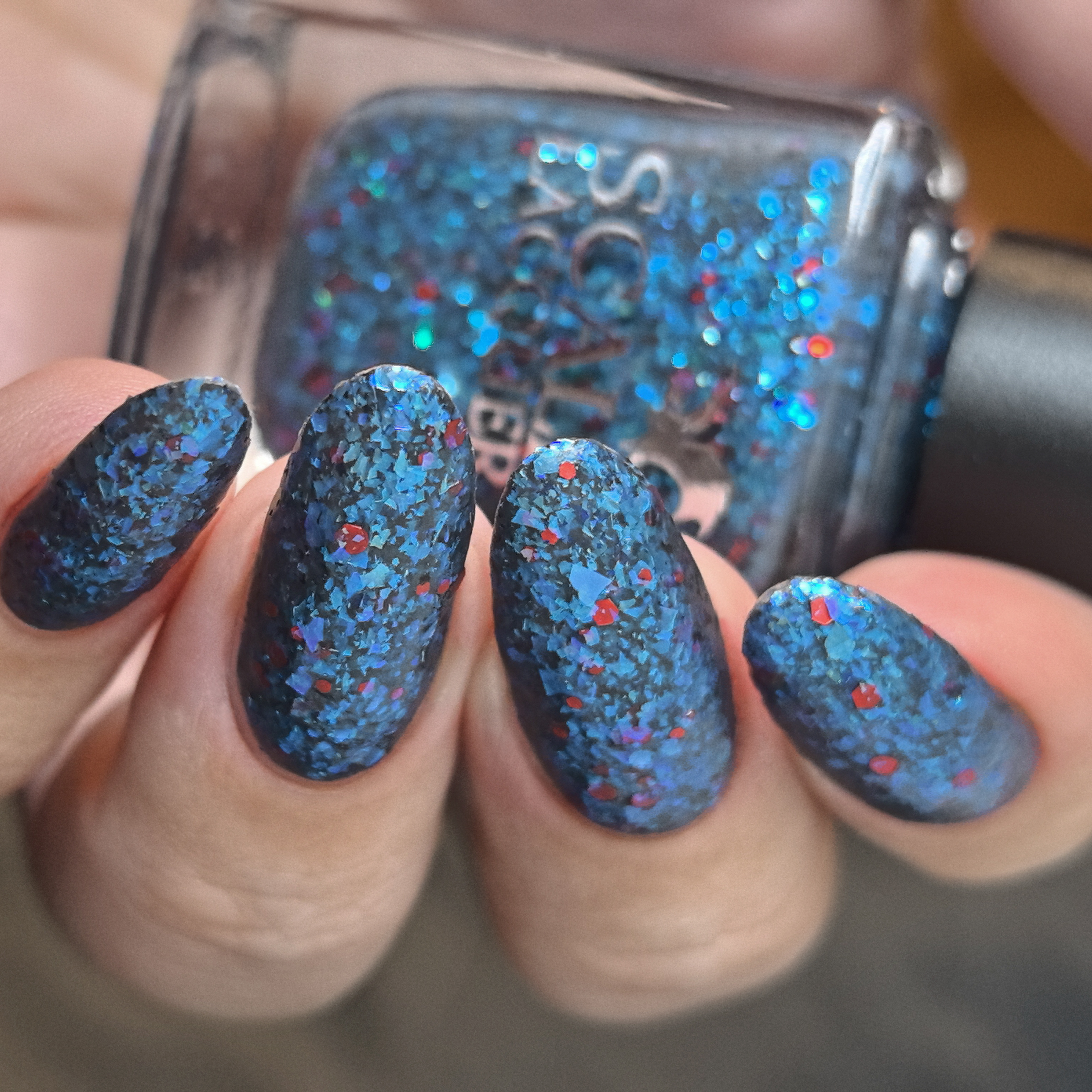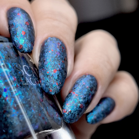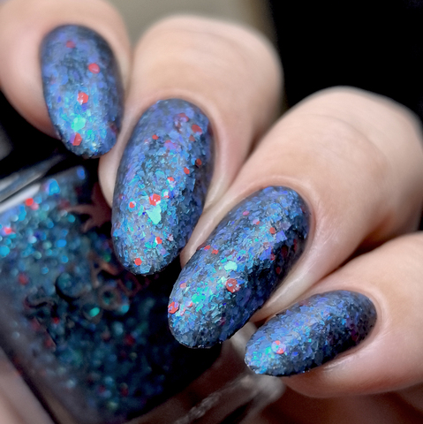 Микс голубой слюды и разноразмерного шестигранного и круглого красного глиттера в темно-серой матовой базе