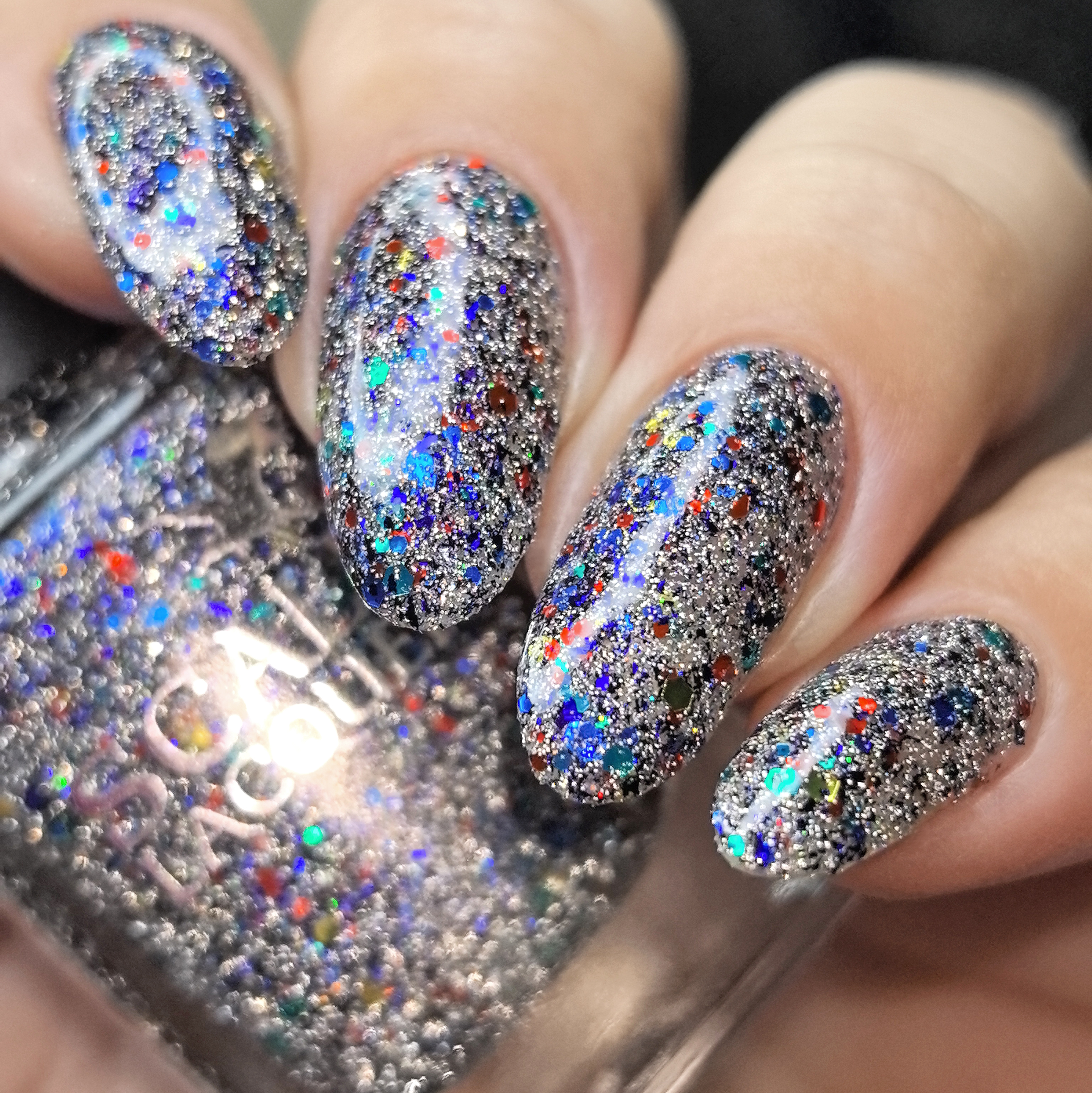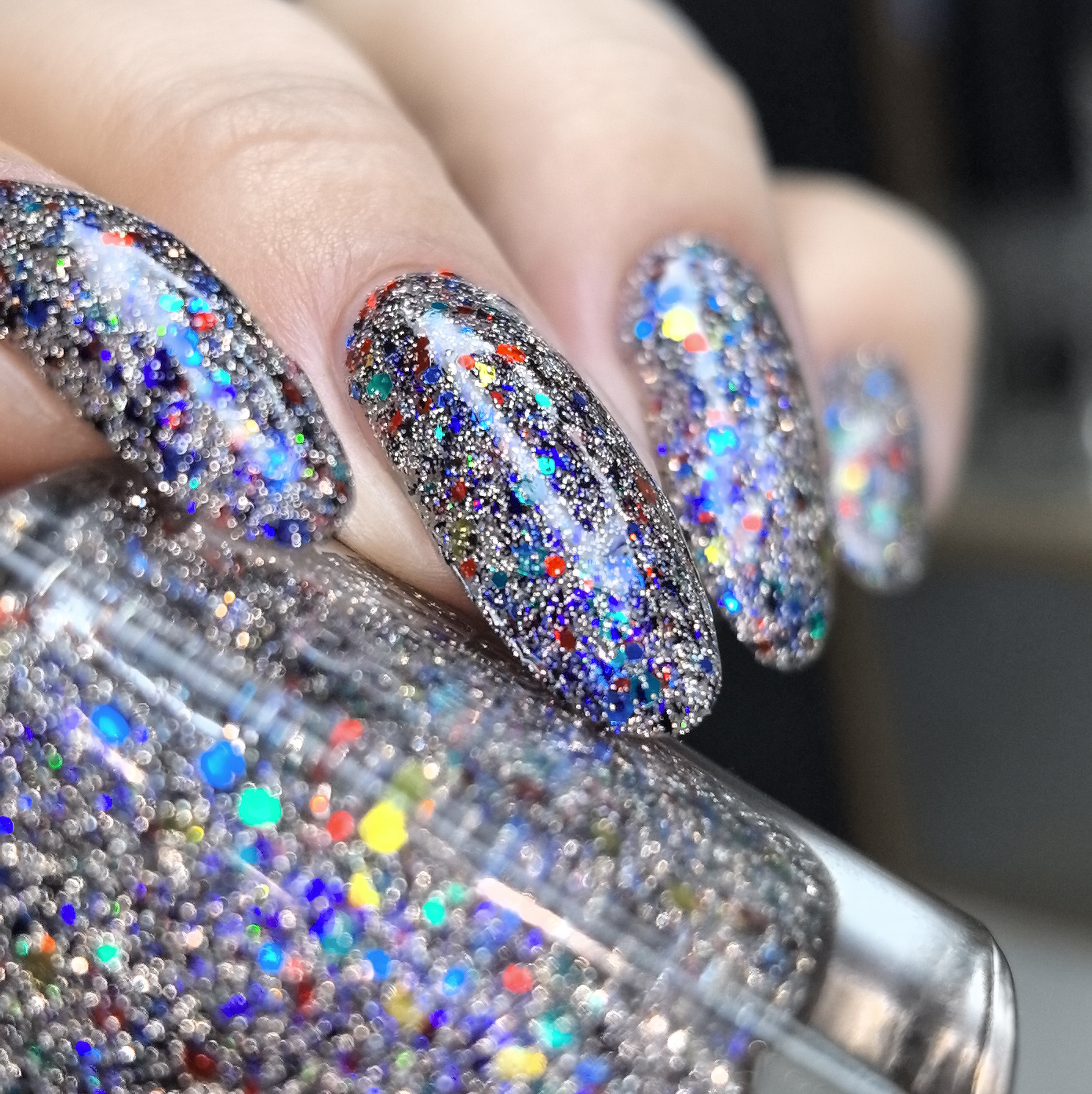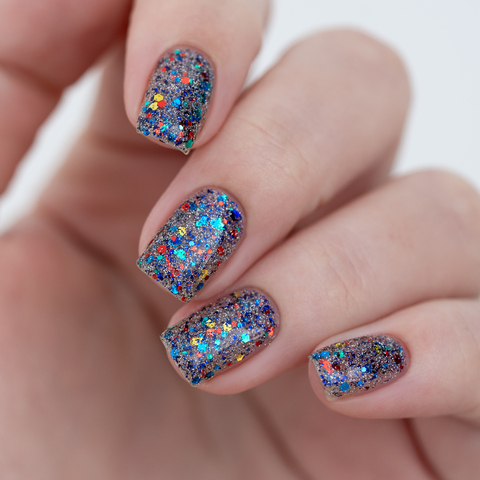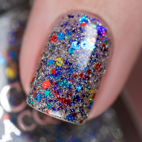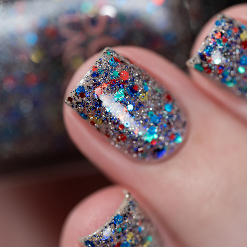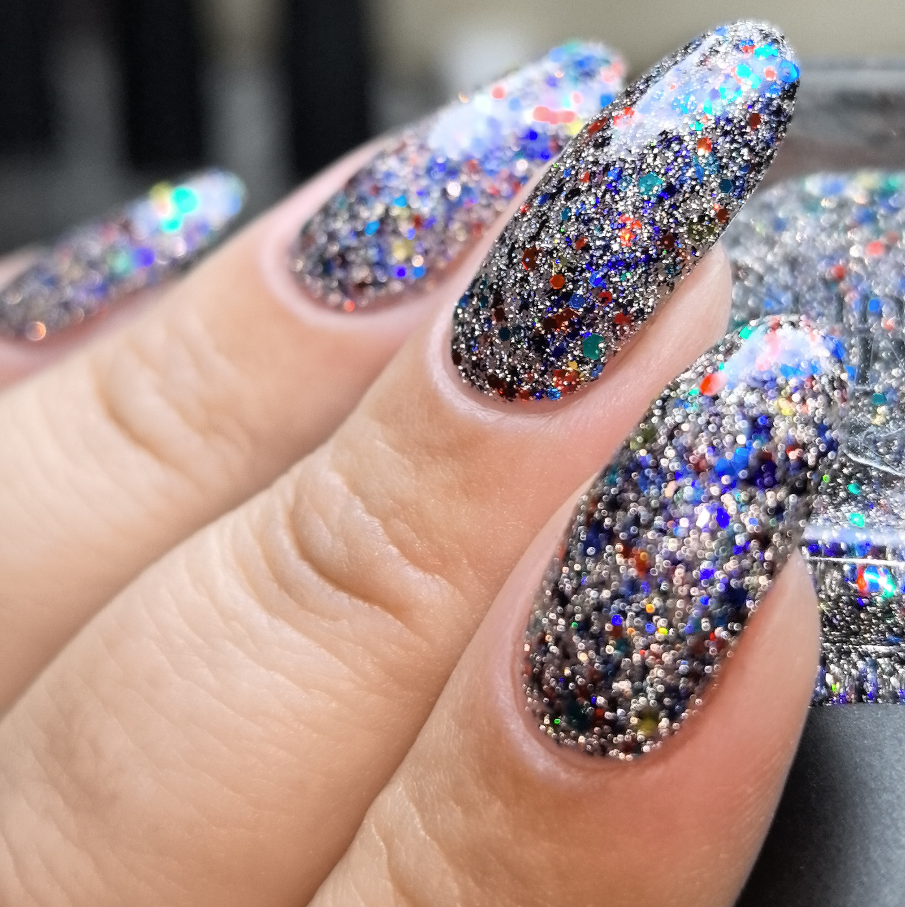 Микс синего, красного, зеленого и золотого глиттера с черно-синей слюдой и серебряным светоотражающим глиттером