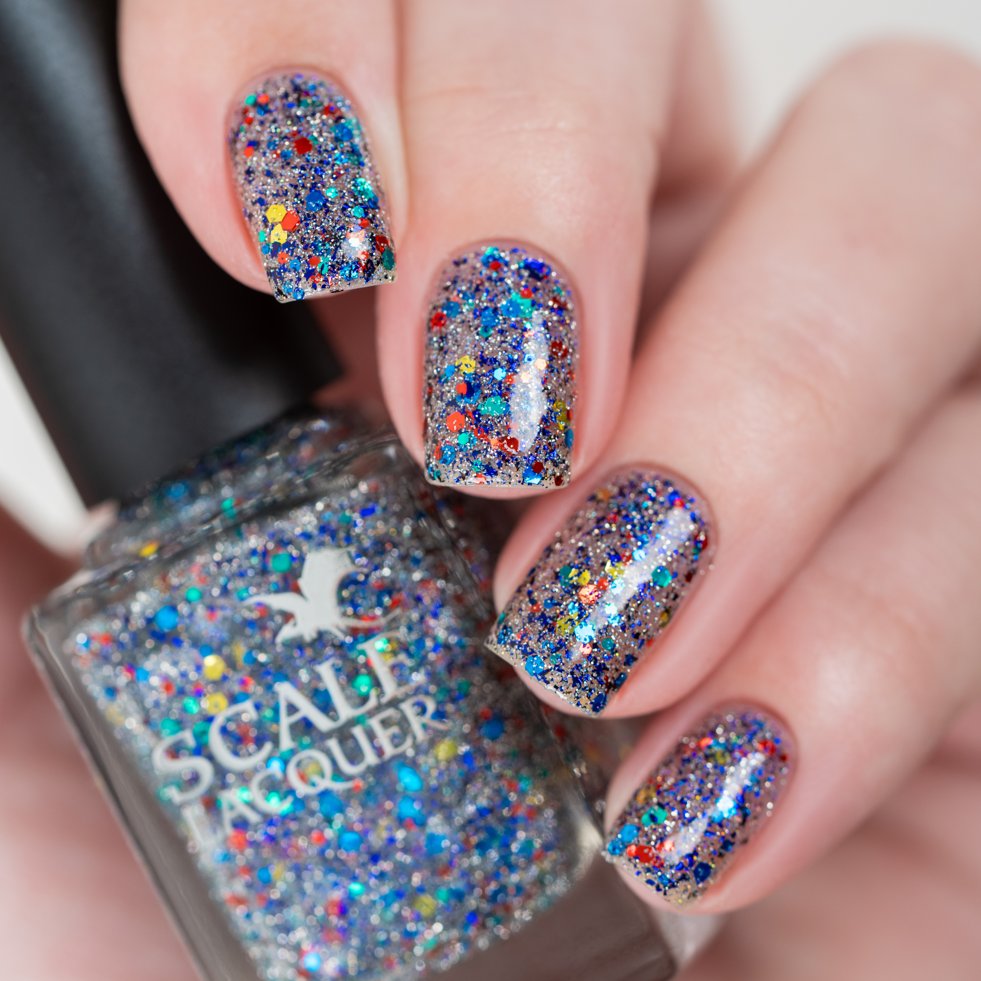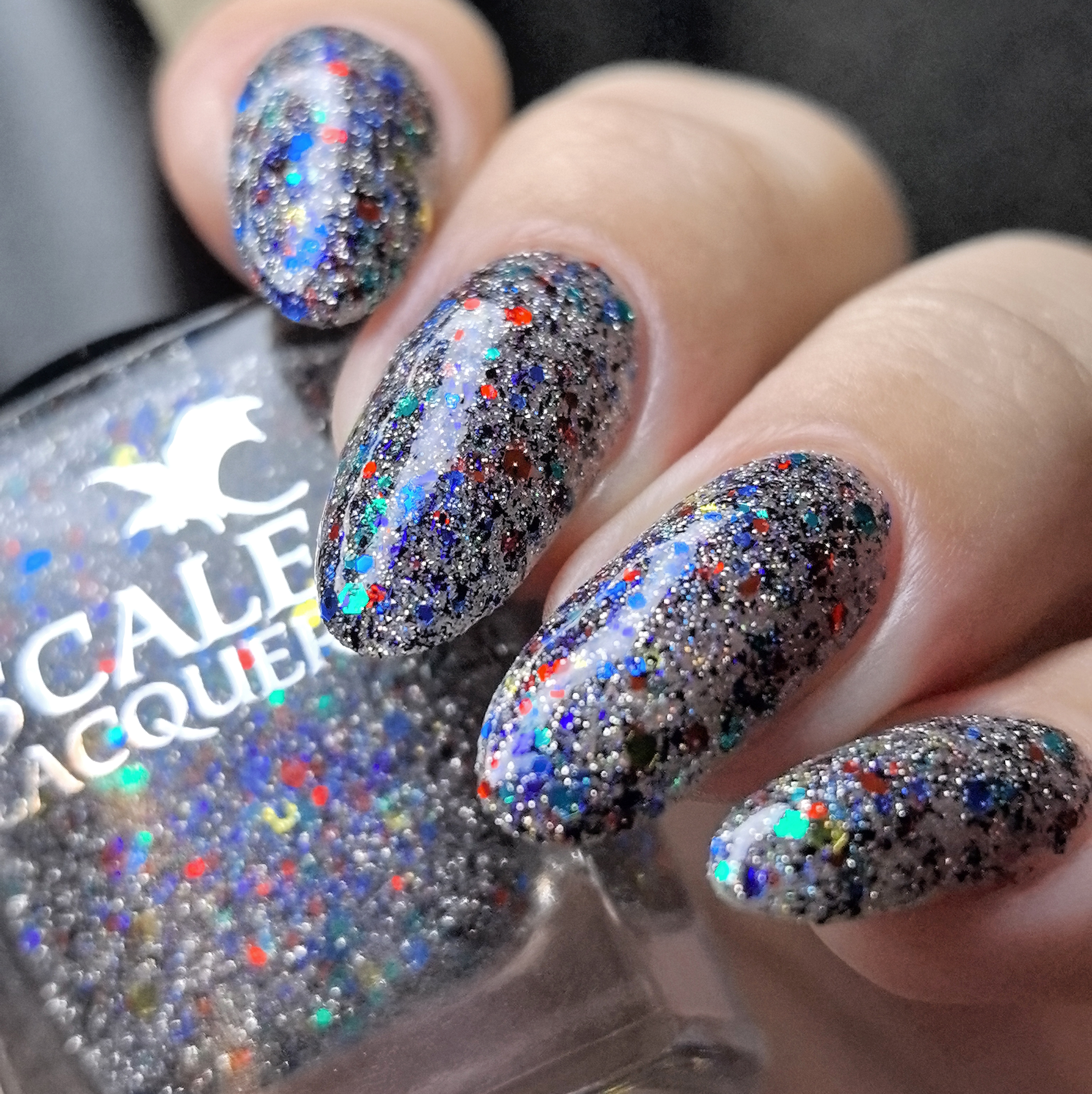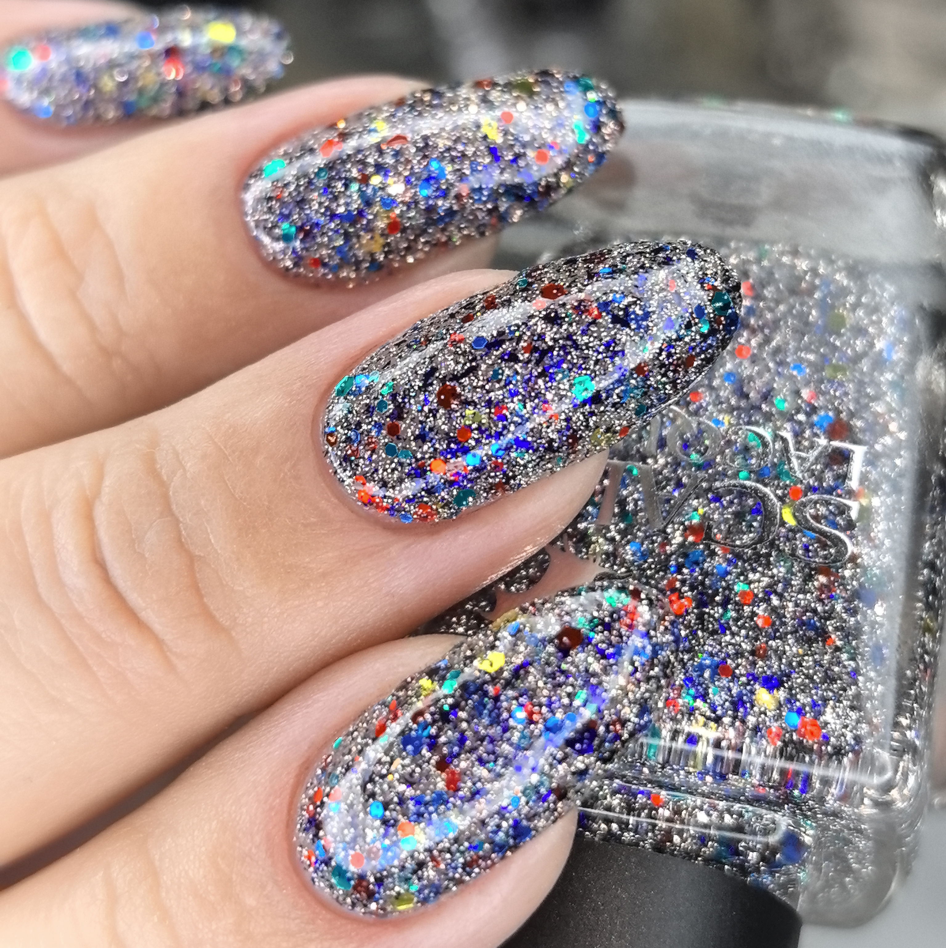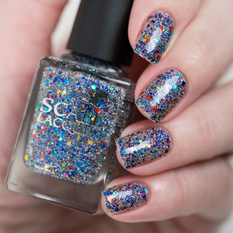 Микс синего, красного, зеленого и золотого глиттера с черно-синей слюдой и серебряным светоотражающим глиттером